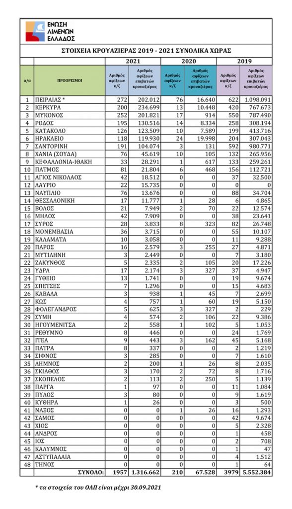 Για τον Οργανισμό Λιμένος Πειραιώς τα στοιχεία αναφοράς αφορούν την περίοδο έως 30-9-2021. Εκτιμούμε ότι με την ενσωμάτωση των τελικών στοιχείων έτους για τον Πειραιά, ο συνολικός αριθμός επιβατών σε ολόκληρη τη χώρα θα ξεπεράσει τα 1.400.000 και ο αριθμός κρουαζιερόπλοιων τα 2000, δηλαδή ελαφρώς άνω του ορίου του 50% σε σχέση με την κίνηση του 2019.